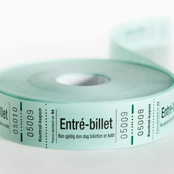 Adgangsbilletterne på ruller fås i fem farver - rød, gul, lilla, grøn eller rosa - og er med fortløbende numre. Adgangsbilletterne er i størrelsen 3,2 x 6,2 cm