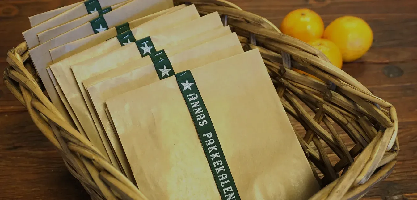 Til den lynhurtige pakkekalender skal du bruge papirposer, gavebånd og en klipsemaskine (med klips) og 24 små pakker og gerne en fin kurv eller æske til at have pakkerne i. Klip gavebåndet med din egen tekst i passende stykker. Skriv fx modtagerens navn på båndet. Put gaven i posen og buk kanten af posen bagom sammen med toppen af gavebåndet. Klips herefter gavebånd og pose sammen. Vupti så har du et styks flot personlig pakkekalender.