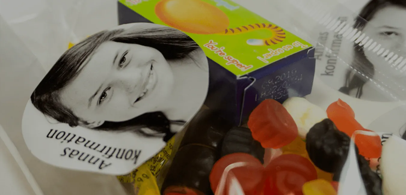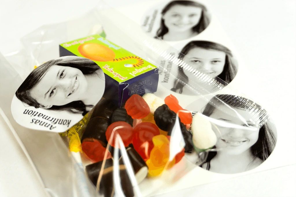 Lav slikposer med k/nonfirmandens yndlingsslik og sæt et klistermærke med et billede på slikposen af festens midtpunkt. I kan også lave en slikbod, hvor gæsterne selv skal blande slikket. Måske en lillesøster eller fætter vil passe boden – så har de en hyggelig opgave. 50 runde klistermærker i ø30mm koster 119,-