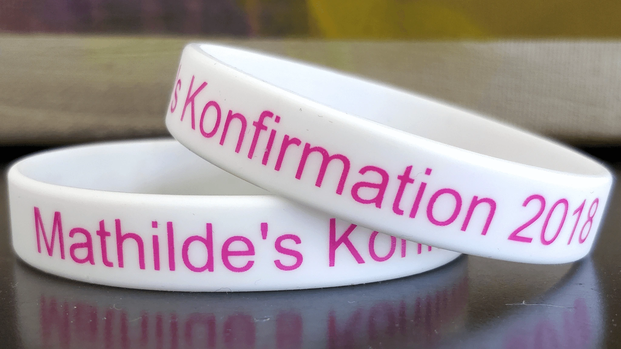 Silikonearmbånd er så fine, hvis man gerne vil give gæsterne et hyggeligt minde om festen. Armbåndene kan snoes om en serviet eller sættes på et glas, så de indgår i bordpynten indtil gæsterne tager dem med sig hjem.