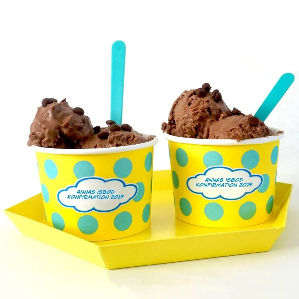 Er k/nonfirmanden vild med is? Så lav isbod til dessert. Køb eller lav masser af forskellige slags is og lad gæsterne selv vælge is, sovs og pynt. Køb papbægre og sæt jeres eget præg på bægrene med et personligt klistermærke fx med et billede af konfirmanden.
