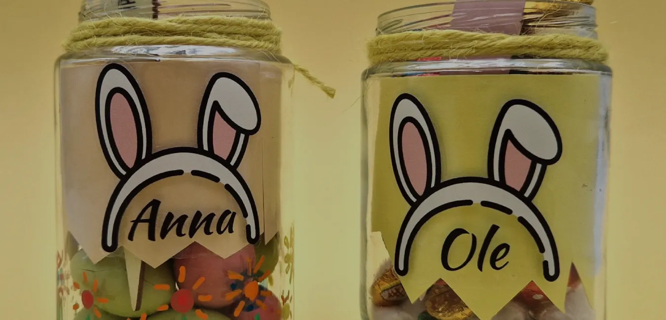 Har du nogle gamle glas fra babymad, rødbeder eller lignende er det let at efterligne påskeglassene. I bestemmer selv om I vil male glassene eller hvordan I vil pynte dem. Her har vi klippet et stykke pap med effekt som et udklækket æg og lagt det ind i glasset. Men det er også ret fint at klippe en silhuet af en kylling eller hare. Når I efterfølgende lægger farverige påskeæg i glasset giver det et fint lille vindue ind til æggene. Uden på glassene har vi sat transparente etiketter med navn og fine kaninører. De helt små klistermærker med "Påsken 2023" er så fine at sætte på alt det påskepynt i laver i år, så man år efter år, kan huske, hvornår man lavede præcis det stykke påskepynt.