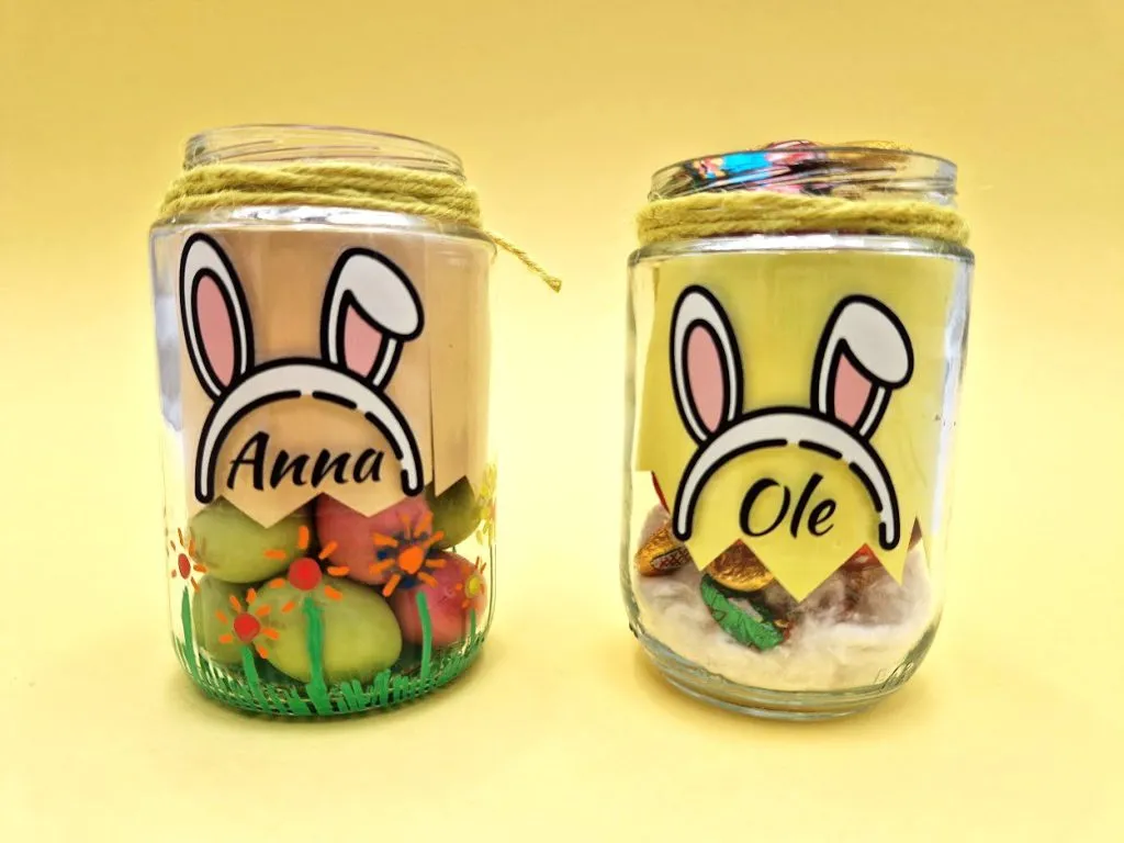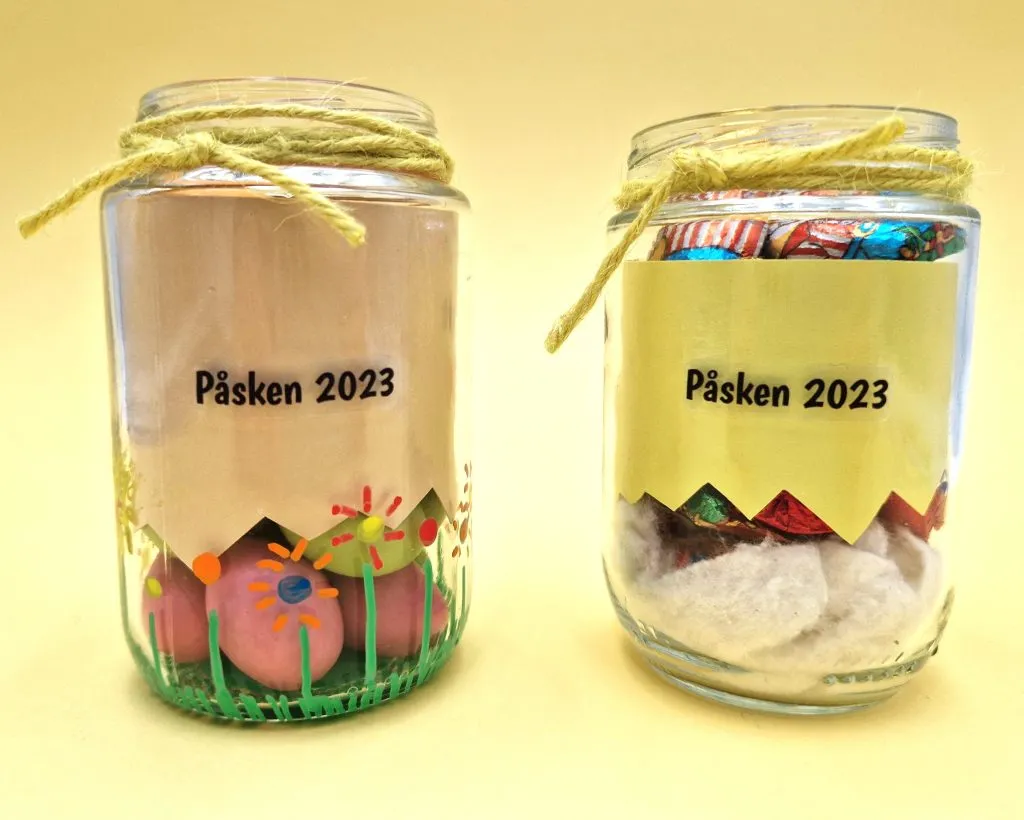 I kan også lave jeres egne påskeglas som på billedet. Påskeglassene fungerer her som bordkort og er samtidig fyldt med påskeæg.