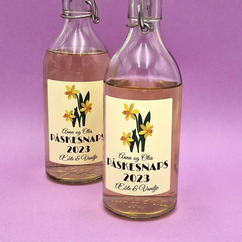 En flot gul påskesnaps pynter også flot på bordet. Har du lavet din egen snaps, skal den selvfølgelig også have sin egen etiket. Design dine etiketter til påskesnapsen, så de passer til den øvrige borddækning.