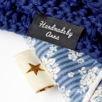 Vi tilbyder nu damaskvævede midtfoldede labels, som du nemt kan sy ind i sømme i tøj og puder eller andre tekstiler. Du kan også bukke enderne og sy mærket omkring en kant, fx på dit strikketøj.