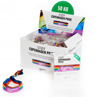 Ikast Etiket har designet en løsning til salg af Pride armbånd. Formålet er at samle penge ind til Pride og arbejdet med menneskerettigheder og ligestilling lokalt og internationalt. Salgsdisplayet designes efter jeres ønsker og indeholder vævede armbånd i specialdesignet plastemballage.